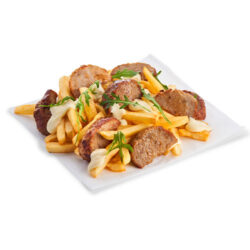 Friet met pittige kip, mayonaise, gebrande ui, mayonaise en piri piri saus